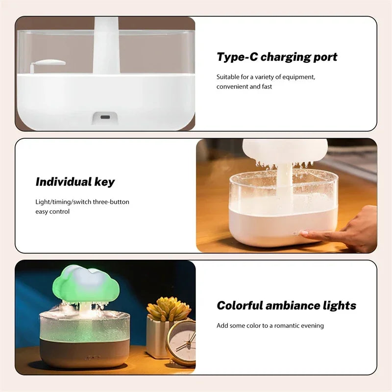 Let the stress of the day fade away as the gentle sound of raindrops and the soft glow of LED lights create a soothing atmosphere. The Rain Cloud Humidifier isn’t just a device, it’s an escape to relaxation. Whether you're winding down for sleep, working on your next big idea, or simply unwinding, this mini oasis fills your space with fresh, scented air, keeping you calm, comfortable, and refreshed.